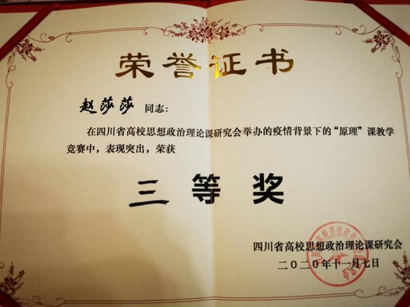 本次年会主题为“疫情背景下的‘原理’课教学”,主要有四个环节:四川省教育厅宣传思想与统战工作处副处长刘海峰向大会传达了中央及教育部相关文件精神;武汉大学教授向久雨以“中国道路的未来”为题,对十九届五中全会精神进行了解读,同济大学教授陈大文以“马克思主义理论教育一体化目标定位”为题,对大思政工作进行了阐释;来自各高校的教师就疫情背景下马克思主义基本原理概论课相关教学问题研究进行了主题发言和讨论;开展了“马克思主义基本原理概论”课程教学竞赛,赵莎莎参加了此次教学竞赛并荣获“三等奖”。