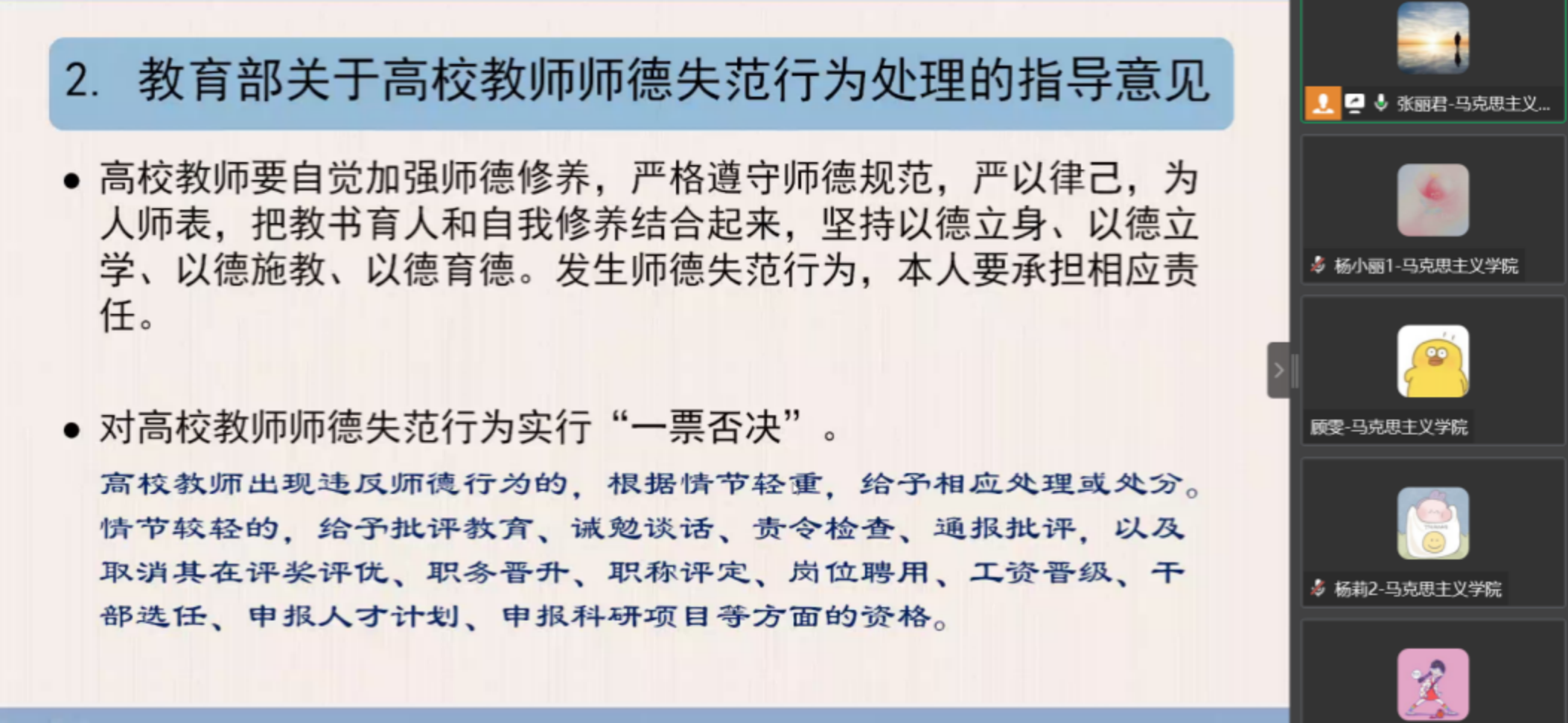 培训中,张丽君着重介绍了教育部“关于新时代高校教师职业行为十项准则” “关于高校教师师德失范行为处理的指导意见”,以及学校“教学事故认定及处理办法”,希望新教师恪守教师行为准则,遵守天府学院的各项规章制度,做具有高尚师风师德的高校思政课教师,为党育人、为国育才。