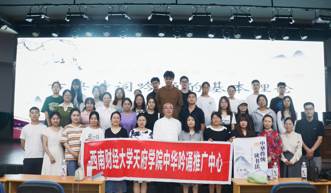 5月18日晚,由马克思主义学院主办、西财天府中华吟诵推广中心承办的“古典诗词吟诵的基本理论”讲座在绵阳校区学术报告厅举行。讲座邀请四川省吟诵学会会长、非物质文化遗产“绵州吟诵”代表性传承人、西财天府中华吟诵推广中心学术顾问王传闻先生主讲,马克思主义学院院长丁灵芝主持,全校师生共计300余人参与。