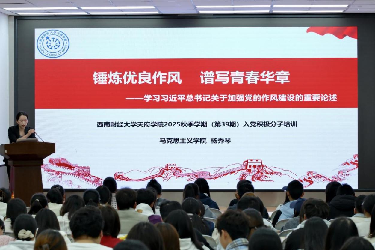 为深入学习贯彻习近平新时代中国特色社会主义思想,扎实推进全党作风建设学习教育,10月25日,学校2025年秋季学期(第39期)入党积极分子培训在成都、德阳、绵阳三校区同步启动。学院王欢、叶璇、杨秀琴三位教师以“锤炼优良作风,谱写青春华章”为题,围绕习近平总书记关于加强党的作风建设的重要论述开展专题授课。