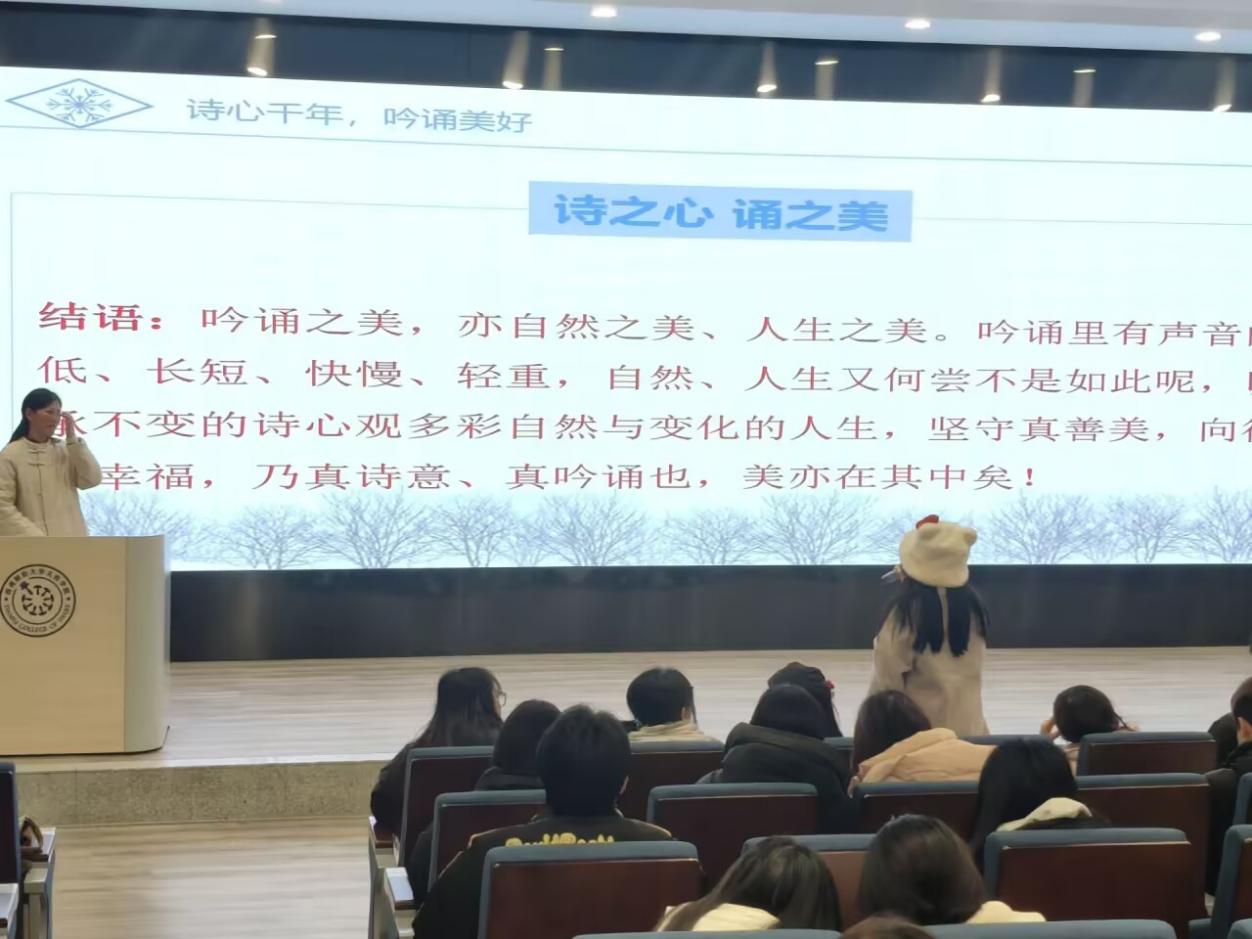 沈德存以“诗心千年 吟诵美好”为主线,围绕“诗之名、诗之意、诗之心、诵之美”四个方面展开讲解。她从文字学角度追溯诗歌本源,结合经典诗词解析韵字规律及篇章结构,并带领师生现场吟诵,在韵律流转中体悟诗词意境,让大家对诗歌起源与古典艺术魅力有了更清晰的认知。讲座尾声,沈德存以“吟诵之美,亦自然之美、人生之美”总结发言,点明吟诵的节奏与自然规律、人生哲理一脉相通。她希望大家坚守诗心、秉持真善美,感悟中华吟诵艺术的精髓,传承和弘扬中华优秀诗词文化。