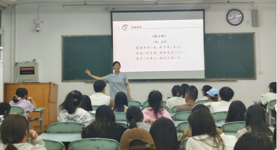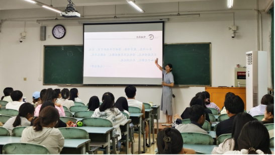 沈德存以“古诗文吟诵与生活之美”为主题,围绕吟诵的定义及其历史渊源等相关基础知识进行讲解。现场吟诵,她以《大学》为例,通过平仄顿挫的吟诵节奏,将儒家经典中的深邃内涵转化为声律体验,在抑扬顿挫间传递古人对道德完善的执着追求,使同学们在庄重深邃的韵律中感悟儒家思想精髓。随后,她挖掘了经典诗词中四季轮换的自然风光之美以及烟火人间的日常生活之美,从诗的教化功能、情感表达等角度出发,以独特的吟诵方式,将其中蕴含的生活哲学娓娓道来。互动环节,同学们踊跃尝试,或低吟浅唱,或慷慨激昂,现场气氛活跃。