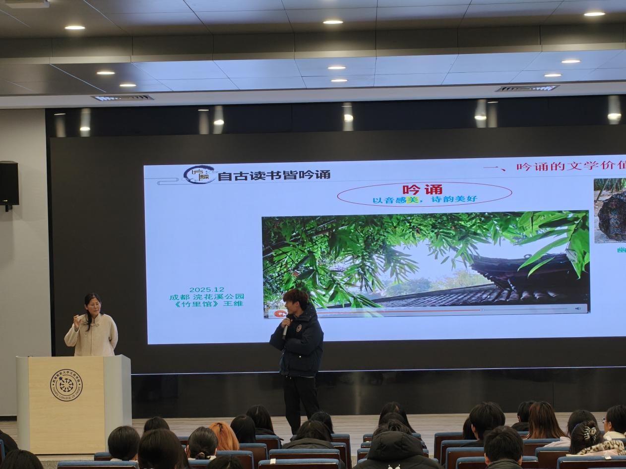 12月17日,由马克思主义学院主办、西财天府中华吟诵推广中心承办的“吟诵传韵 经典启声”主题吟诵讲座在绵阳校区5103教室举行。本次活动邀请西南财经大学天府学院图书馆馆员、原四川传统文化研究中心主任、四川省吟诵学会理事沈德存担任主讲,共计200余名师生参加活动。