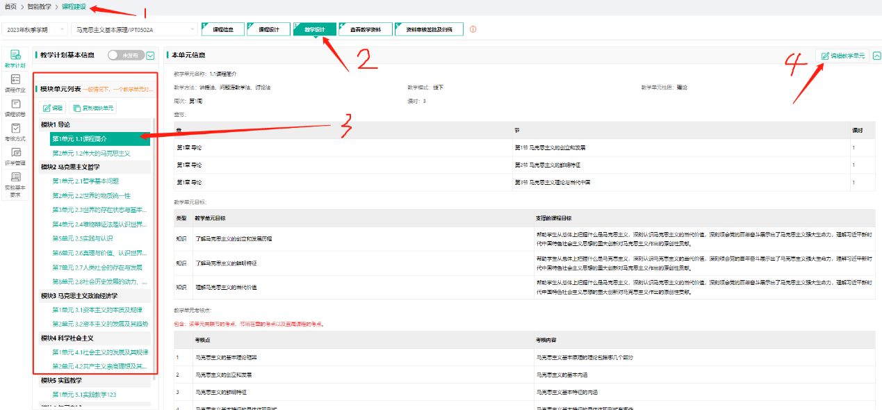 注意:我们大部分课程都是每个老师负责一个版块完成集体备课和教学设计,每位老师在 EQ上做教学设计的时候一定要认真,这些内容关系到我们最后导出来的教学大纲和教案内容格式是否统一,所以在建课的时候填写一定要规范,格式要保持一致。另外,我们的课程几乎都已经在EQ开展过课程建设了,课程建设的模板是可以从往年直接复制,但是我们的教材内容会有变化,教学设计也会调整,老师们必须要根据最新版本教材内容和要求重新设置或修改一遍。每个单元的教学设计操作步骤如下图: