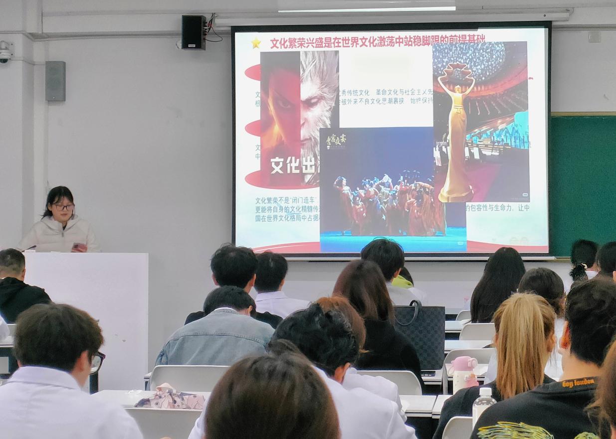 学生以小组为单位,选择不同题目,采用不同方式进行课堂展示。有的小组以“文化繁荣发展的重要意义”为题,以“黑神话·悟空”“唐宫夜宴”等案例为切入点,采用趣味问答形式,探讨了文化繁荣对实现中华民族伟大复兴的重要性。有的小组以“社会主义核心价值观引领文化建设”为题,采用“短视频+故事讲解”方式,从国家、社会、公民三个层面讲述了社会主义核心价值观的主要内容。有的小组以“铸就社会主义文化新辉煌”为题,从传承发展中华优秀传统文化、繁荣发展文化事业和文化产业、不断提升国家文化软实力和中华文化影响力等方面展开讨论,并结合具体数据和典型案例分析当前社会主义文化发展的现状和挑战。