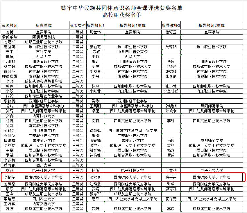 11月7日至9日,由四川省教育厅、中共四川省委宣传部、四川省民族宗教事务委员会联合主办的四川省首届铸牢中华民族共同体意识教育“名师金课”评选活动决赛在西南民族大学航空港校区举行。学院教师李艳萍荣获佳绩。