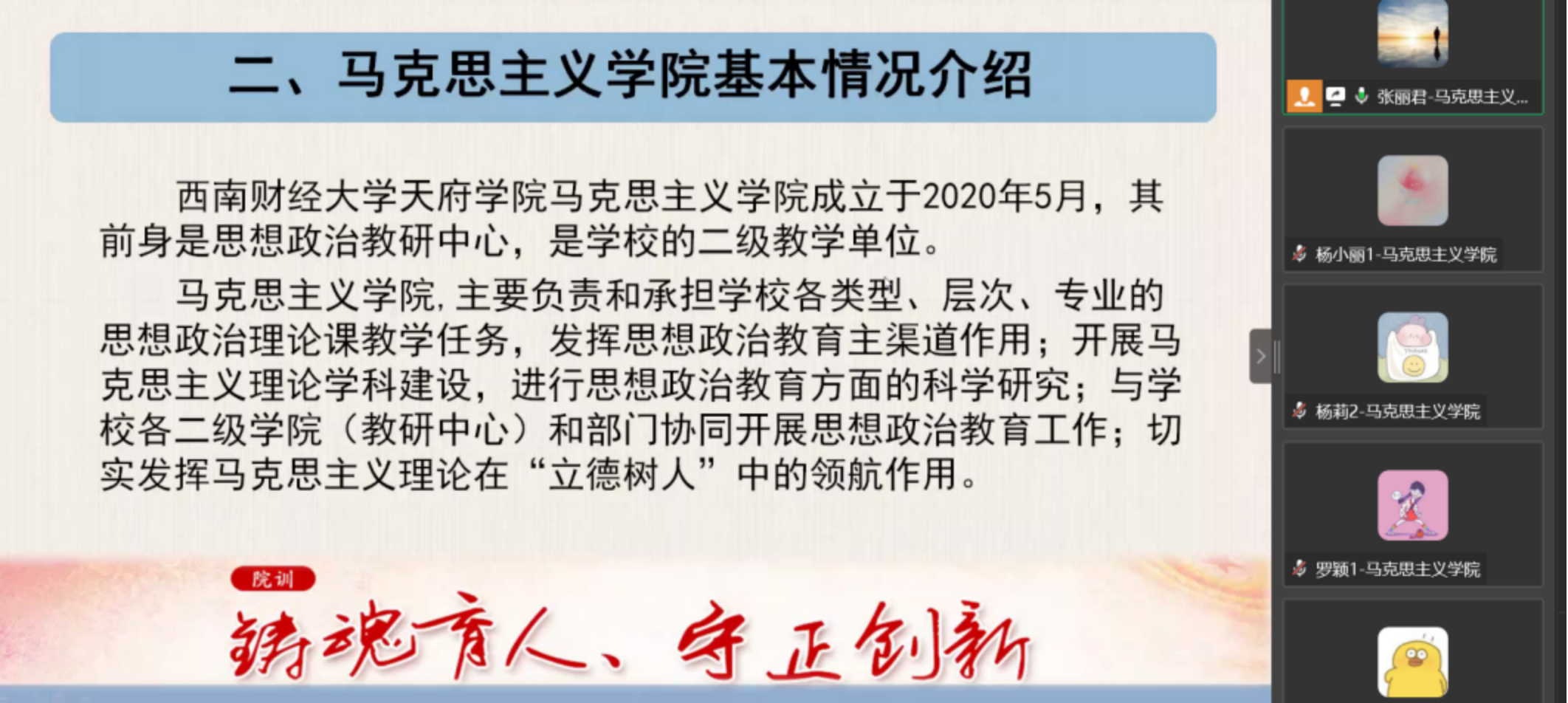 8月24日晚,马克思主义学院组织开展了2022年秋季学期新教师入职培训。本次培训通过企业微信平台进行,由马克思主义学院院长助理张丽君主持。 ?张丽君介绍学院基本情况?此次培训内容包括高校教师师风师德和行为规范、学校及学院基本情况、天府学院思政课教学理念和教学模式、职称评定与科研工作要求,以及教学外的日常工作注意事项等。通过培训,帮助...