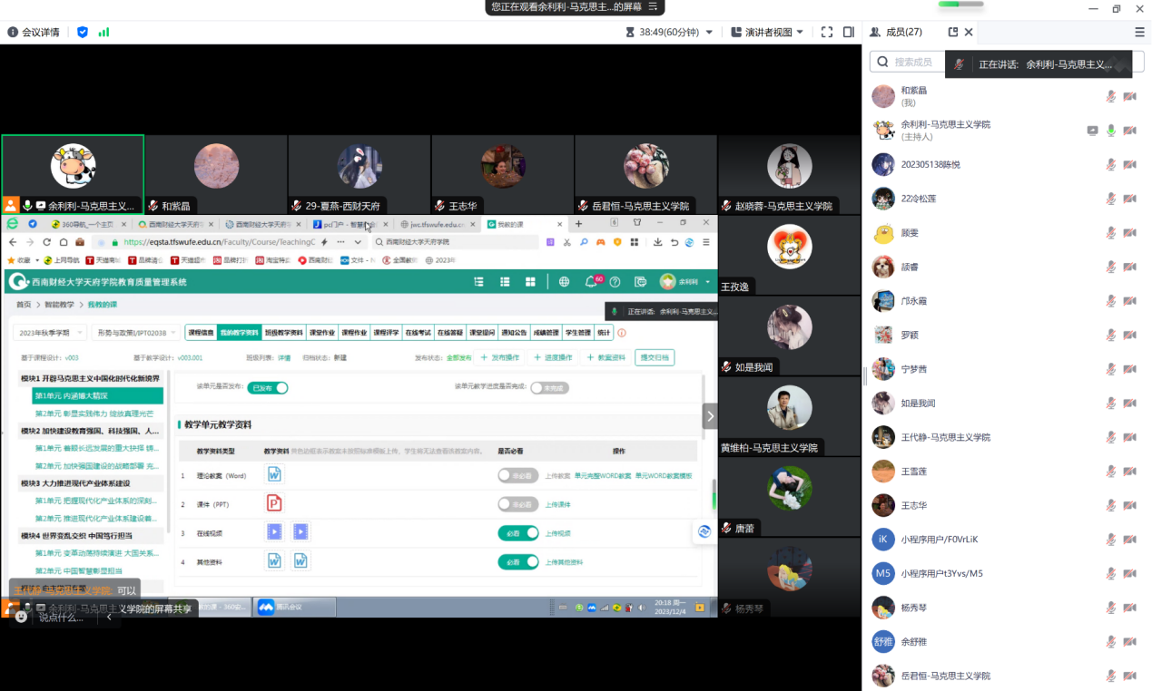 12月4日晚,马克思主义学院形势与政策教研室通过企业微信召开了12月教学研讨会。本次会议由余利利老师主持,教研室全体教师参加。余利利主持会议本次会议主要围绕教学分享和教学安排两个内容进行。教学分享阶段,夏燕作“革命文物是讲好思政课的生动教材”主题分享,她认为将革命文物融入思政课有助于学生厚植爱国主义情怀,并展示了前期整理的川内红色...