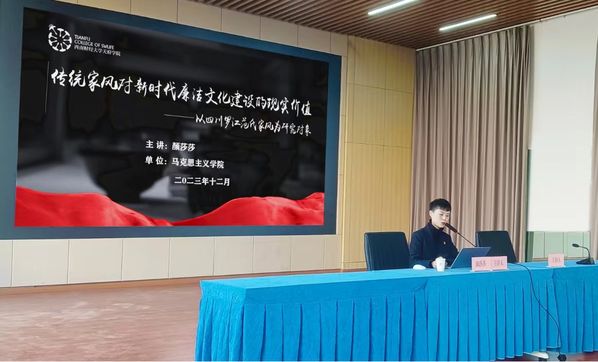 12月4日上午,由中共德阳市罗江区委宣传部主办的“文明实践天天见”新时代文明实践理论宣讲在罗江区万安镇奎星阁社区居委会举行。此次宣讲由学院教师颜莎莎主讲,罗江区机关干部和社区群众参加学习。颜莎莎以“传统家风对新时代廉洁文化建设的现实价值——以四川罗江范氏家风为研究对象”为主题,从四川省级廉洁文化教育基地罗江范家大院家风文化园切入...