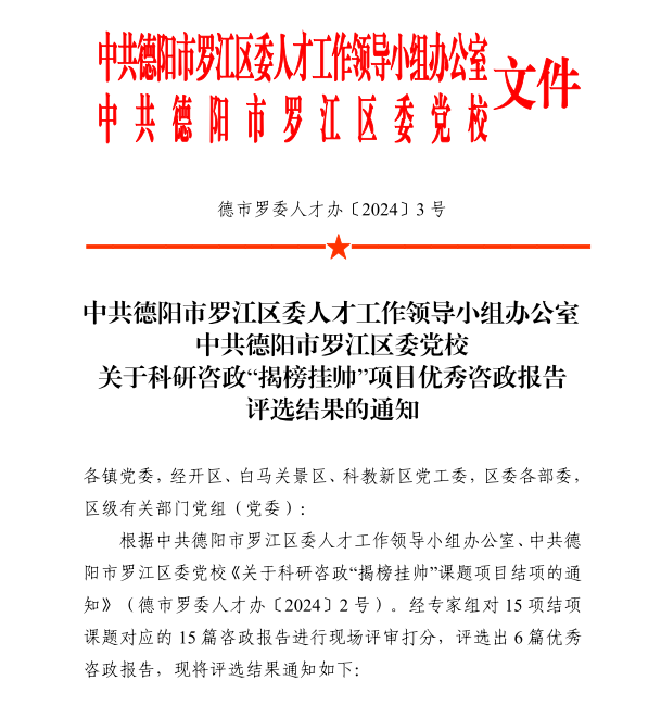 学院一项课题获德阳市罗江区科研咨政“揭榜挂帅”项目优秀咨政报告二等奖